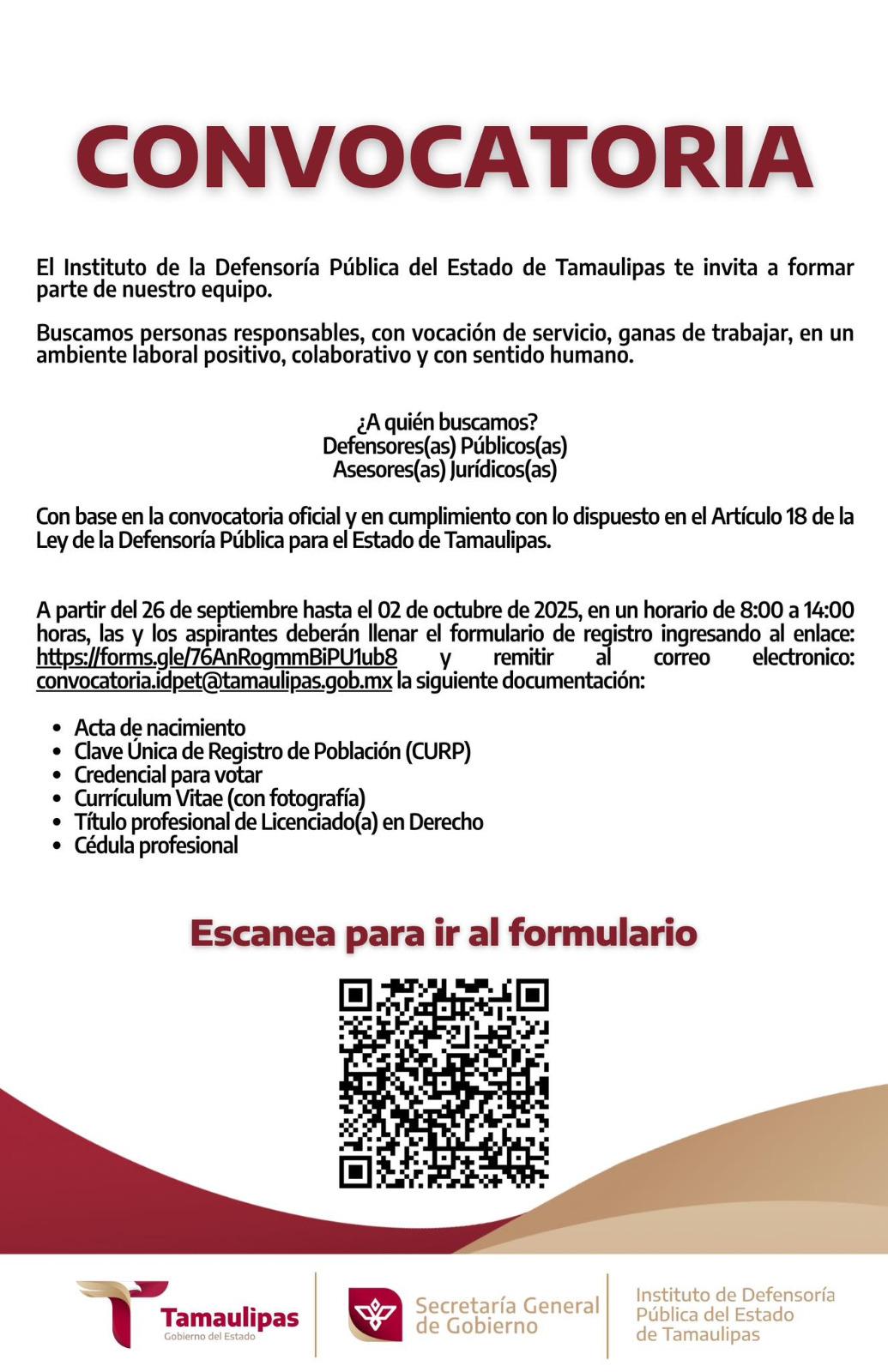 Ciudad Victoria, Tamaulipas. — El Instituto de la Defensoría Pública del Estado de Tamaulipas abrió una convocatoria dirigida a profesionales del Derecho interesados en integrarse como defensores públicos o asesores jurídicos, precisando que el registro estará disponible del 26 de septiembre al 2 de octubre de 2025, en horario de 8:00 a 14:00 horas.