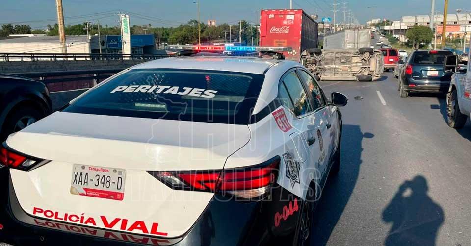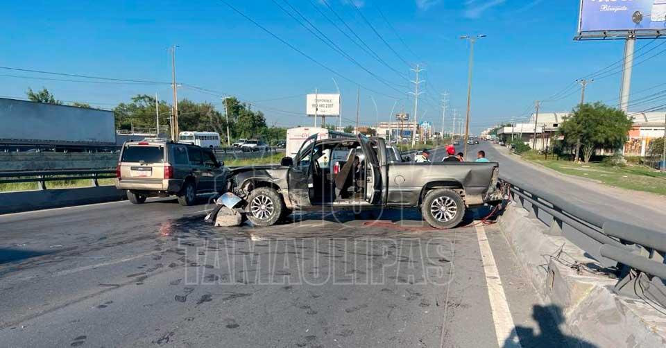 Reynosa, Tamaulipas. — Un aparatoso accidente vehicular se registró esta mañana en el libramiento a Monterrey, a la altura del antiguo centro comercial Chedraui, donde dos vehículos colisionaron, resultando uno de ellos volcado y el otro con severos daños en la parte frontal.