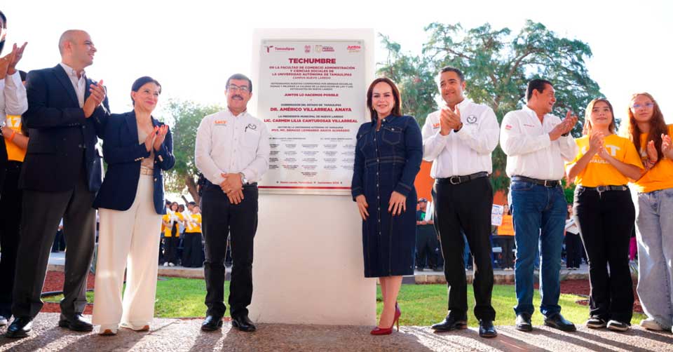 Nuevo Laredo, Tamaulipas.-La alcaldesa Carmen Lilia Canturosas Villarreal, junto al rector de la Universidad Autónoma de Tamaulipas (UAT), Dámaso Anaya Alvarado, entregaron la nueva techumbre en la Facultad de Comercio, Administración y Ciencias Sociales de Nuevo Laredo, una obra de gran trascendencia para la comunidad universitaria con una inversión superior a los 6 millones de pesos.