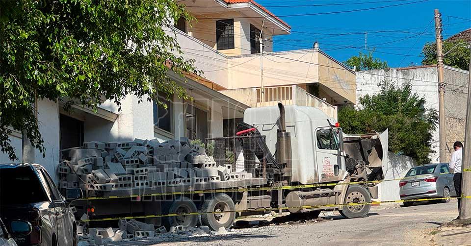 Tampico, Tamaulipas. - Un tráiler con plataforma que transportaba block y presuntamente se quedó sin frenos en una pendiente, se fue de reversa y terminó impactándose con una residencia en la colonia Lomas de Rosales de Tampico.