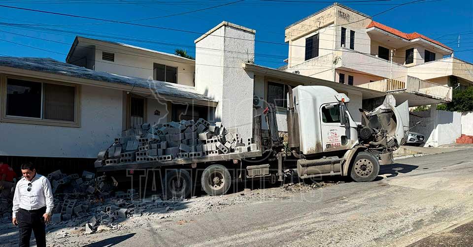 Presuntamente el tractocamión color blanco propiedad de la empresa Triturados y Premezclados de Altamira subía la pendiente, cuando presuntamente le fallaron los frenos provocando que se fuera en reversas para terminar impactándose contra la vivienda.