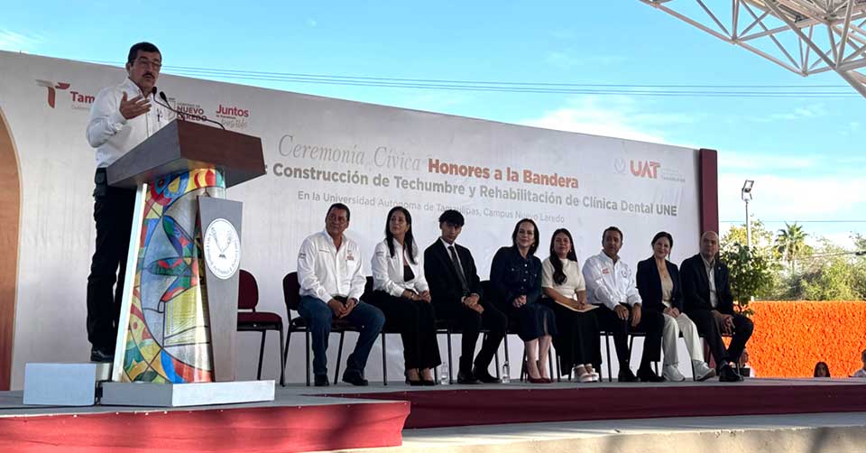 Nuevo Laredo, Tamaulipas. - El rector de la Universidad Autónoma de Tamaulipas (UAT), Dámaso Anaya Alvarado, encabezó, junto a la presidenta municipal de Nuevo Laredo, Carmen Lilia Canturosas Villarreal, la ceremonia cívica de honores a la bandera y la entrega de la nueva techumbre en la Facultad de Comercio, Administración y Ciencias Sociales de Nuevo Laredo.