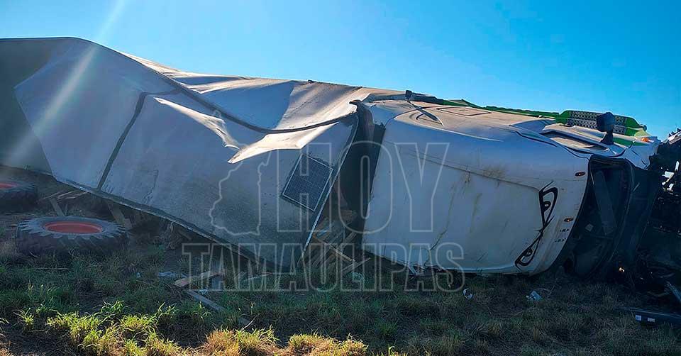 Nuevo Laredo, Tamaulipas. — Un tráiler cargado con acumuladores volcó esta mañana en el kilómetro 187 de la Autopista a Monterrey, en el tramo de norte a sur, dejando a su operador con heridas menores.
