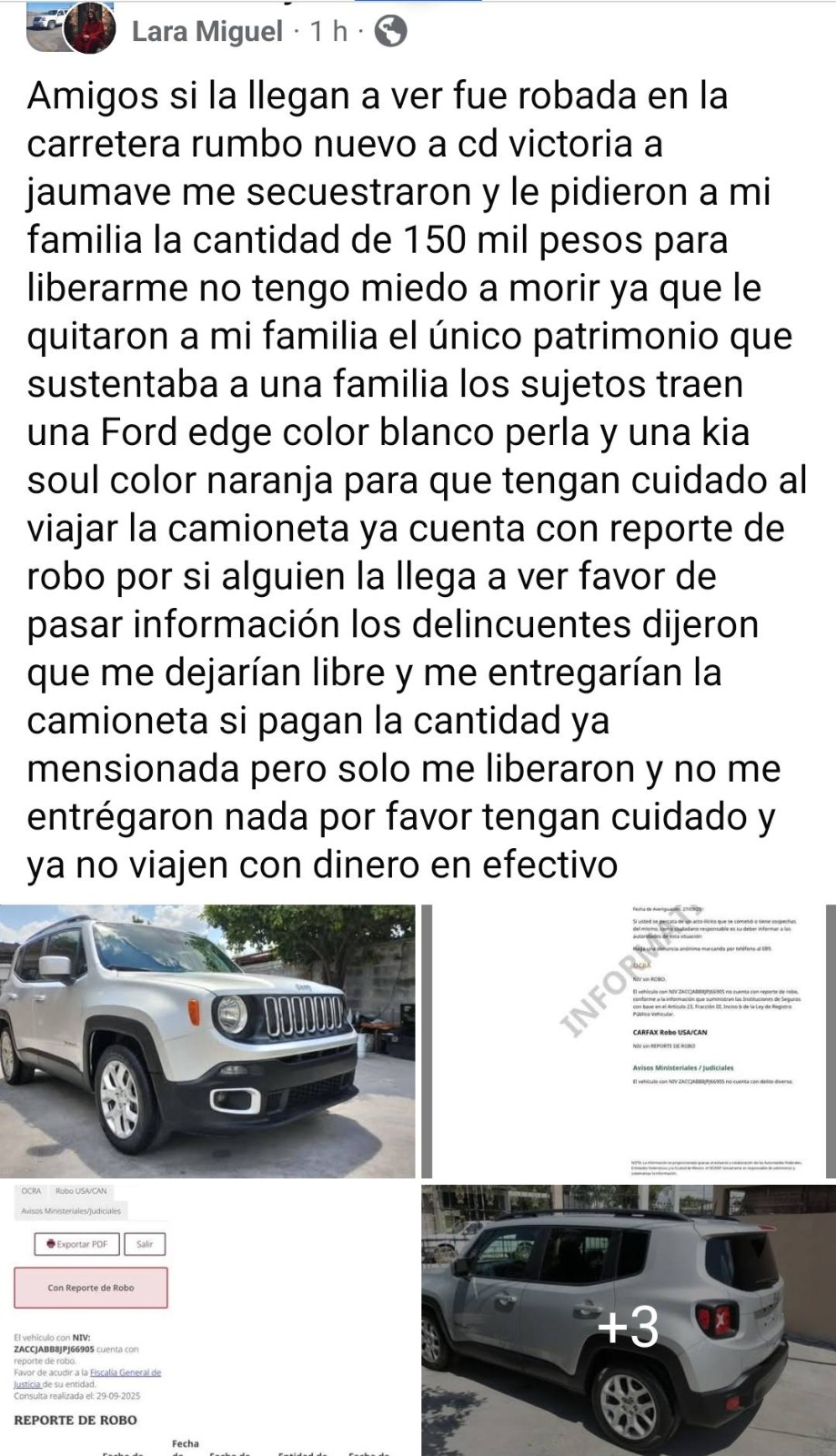Ciudad Victoria, Tamaulipas. – Un ciudadano originario de San Luis Potosí, identificado como Lara Miguel, denunció públicamente a través de su cuenta de Facebook haber sido víctima de robo de vehículo y secuestro en la carretera Rumbo Nuevo, en el tramo Ciudad Victoria–Jaumave, el pasado 26 de septiembre.