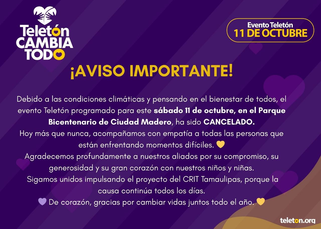 Ciudad Madero, Tamaulipas. - Debido a las condiciones climáticas que prevalecen en la zona sur de Tamaulipas, el evento Teletón programado para este sábado 11 de octubre en el Parque Bicentenario de Ciudad Madero fue cancelado.
