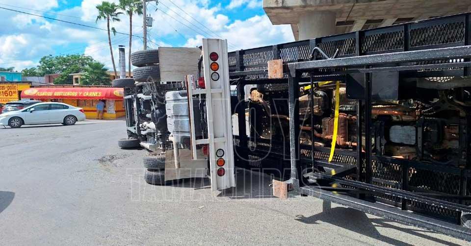 Vuelca nodriza que transportaba vehículos hacia un yonke en Matamoros