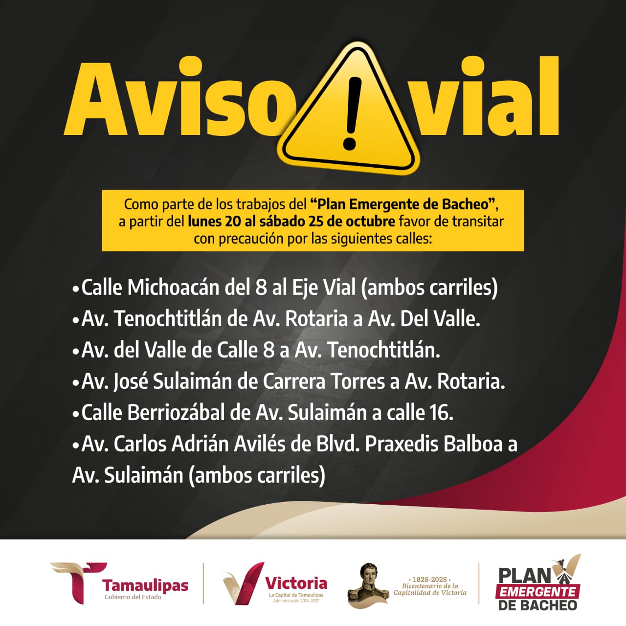 Ciudad Victoria, Tamaulipas. - Para que ciudadanos y conductores tomen previsión en sus rutas de traslado a centros laborales y educativos, el gobierno de Victoria informa que este lunes el Programa Emergente de Bacheo continuará en distintos sectores de la ciudad.
