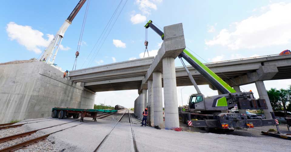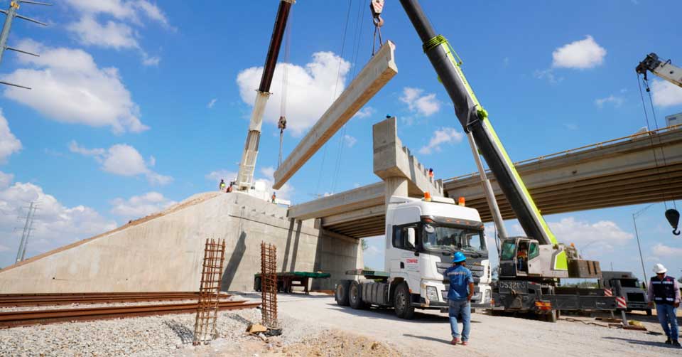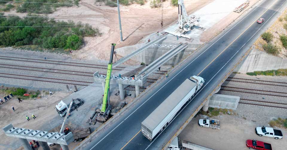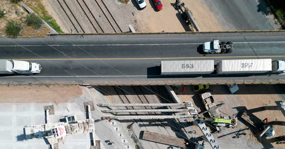 Explicó que actualmente se realiza las maniobras para la instalación de cuatro trabes o vigas principales que servirán de soporte a las losas de rodamiento por donde circulará el tráfico pesado; cada una de estas piezas tiene 22.6 metros lineales de largo y 1.5 metros de alto, y se colocan sobre los cabezales o columnas que dan estructura al puente.
