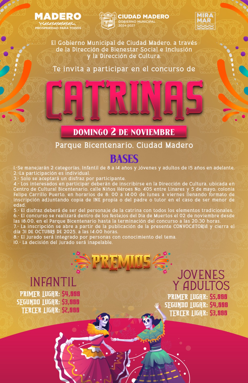 En el Concurso de Catrinas, habrá dos categorías: infantil y jóvenes y adultos, el disfraz deberá ser del personaje de la catrina con todos los elementos tradicionales. Las inscripciones cierran el próximo 31 de octubre a las 2 de la tarde y se premiará a los tres primeros lugares de cada categoría.