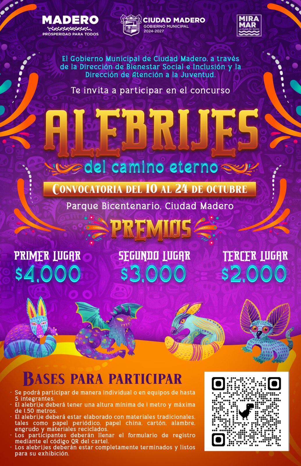 Otro concurso será el de Alebrijes del Camino Eterno, cuya convocatoria cierra el 24 de octubre, y podrá realizarse de manera individual o en equipos. La altura del alebrije será de entre 1.00 y 1.50 metros, elaborado con materiales tradicionales y reciclados como papel periódico y china, cartón, alambre y engrudo.