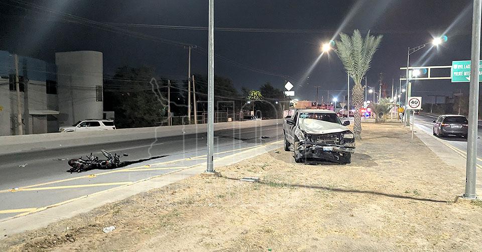Nuevo Laredo, Tamaulipas.— Un trágico accidente en la Carretera Nacional, al sur de la ciudad, dejó un saldo de un hombre sin vida y otro gravemente herido, luego de que la motocicleta en que viajaban fuera impactada por una camioneta.