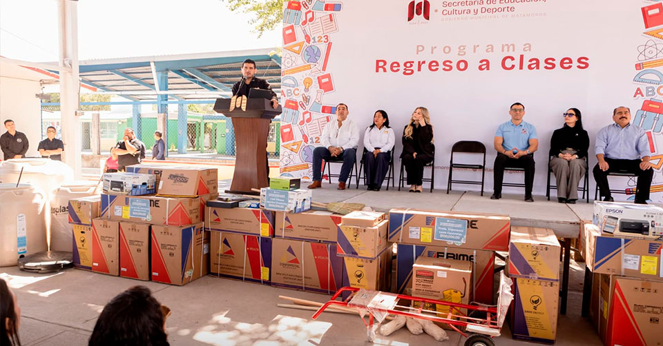 Matamoros, Tamaulipas. - El presidente municipal, Beto Granados, encabezó la segunda entrega de apoyos como parte del programa “Regreso a Clases”, beneficiando a 40 planteles educativos de distintos niveles en el municipio. En esta ocasión, las escuelas recibieron aires acondicionados, material deportivo, pintura e insumos destinados a mejorar la infraestructura y el entorno de aprendizaje de niñas, niños y jóvenes matamorenses.