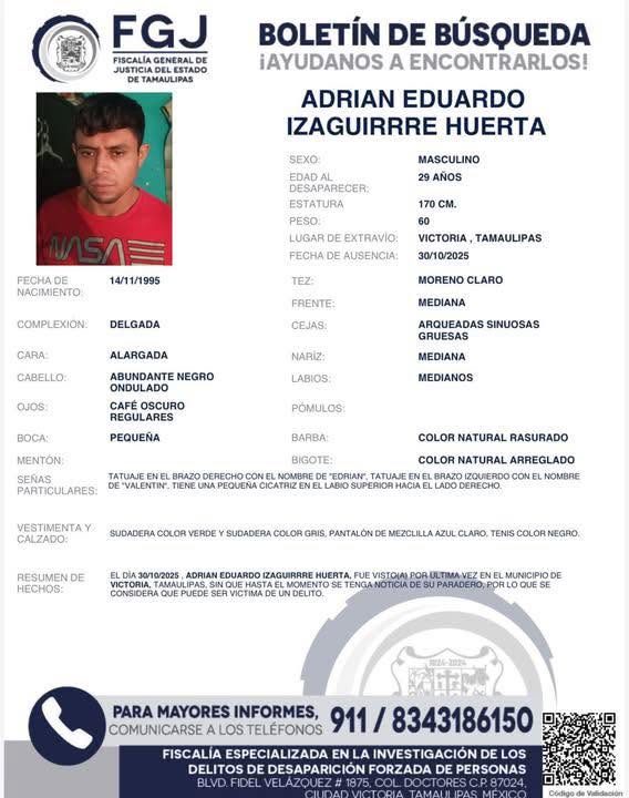 La Fiscalía General de Justicia del Estado emitió fichas de búsqueda para dar con el paradero de los desaparecidos, identificados como Fabricio Brodeli Pérez de la Cruz, de 22 años; Adrián Eduardo Izaguirre Huerta, de 29, y Samuel Estrada Herrera de 31.