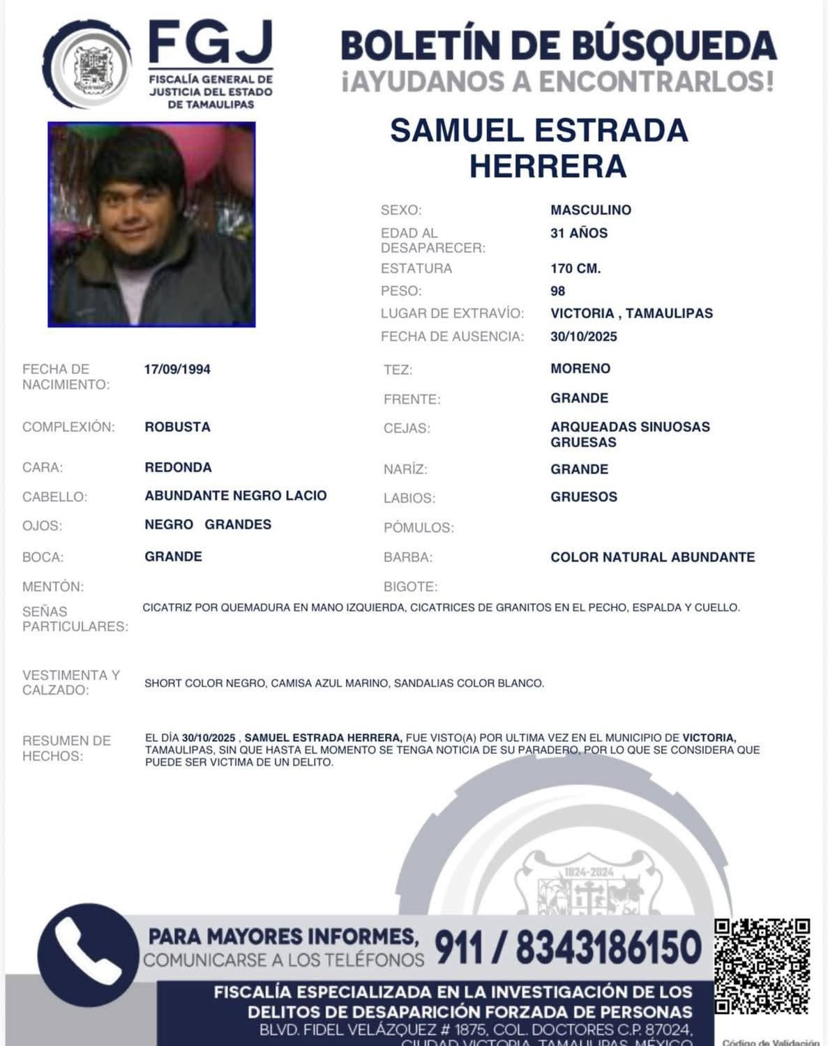 Las fichas de búsqueda detallan que Fabricio vestía pantalón de mezclilla azul y camiseta negra; Eduardo pantalón caqui y playera gris; mientras que Samuel short negro y camisa azul marino.