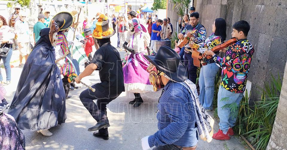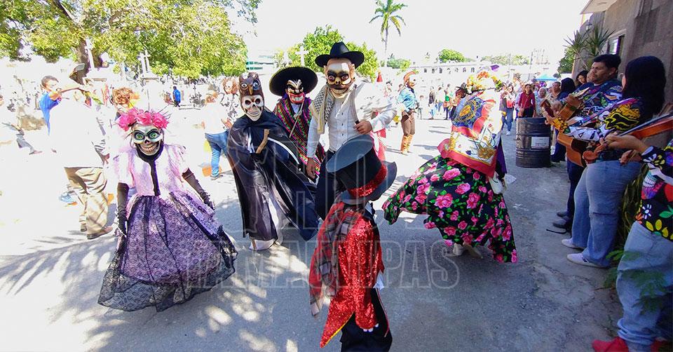 Tampico, Tamaulipas. - El Día de Muertos se vivió con música, color y tradición en el Cementerio Municipal de Tampico, donde la comparsa Los Matlachines de la Cuadra de Pueblo Viejo, provenientes del Estado de Veracruz, animaron la jornada con su característico baile, acompañados por el trío Son de Xant.