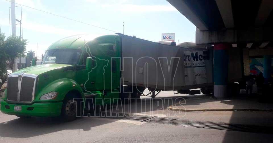 Tampico, Tamaulipas. - Debido a una mala maniobra del operador de un tráiler que perdió la dimensión de donde se encontraba, la unidad de carga quedó atorada bajo el puente del distribuidor vial frente al Hotel Posada de Tampico, generando un caos vehicular.