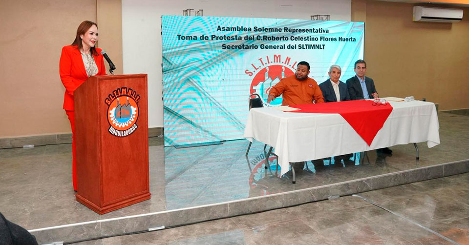 Nuevo Laredo, Tamaulipas. - En un acto significativo para el movimiento obrero, la presidenta municipal Carmen Lilia Canturosas Villarreal, confirmó su liderazgo político y su estrecha relación con la base trabajadora de la ciudad, al acudir como invitada especial a la Asamblea Solemne Representativa del Sindicato Local de Trabajadores de la Industria Maquiladora en Nuevo Laredo donde Roberto Celestino Flores Huerta asumió la Secretaría General del sindicato.