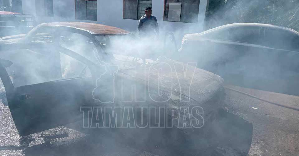 San Fernando, Tamaulipas. - Un vehículo terminó reducido a cenizas luego de incendiarse a causa de un corto circuito registrado la tarde de este martes en la zona centro de San Fernando.