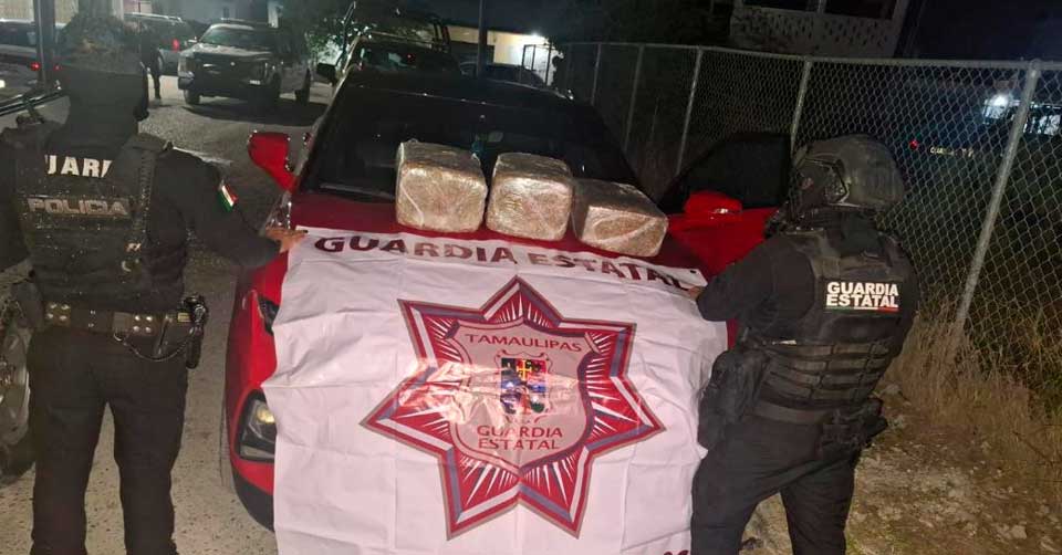 Matamoros, Tamaulipas.- Elementos de la Guardia Estatal aseguraron una camioneta que transportaba tres paquetes de hierba verde y seca con características similares a la marihuana, durante un recorrido de vigilancia en la colonia Villa Las Torres en Matamoros.