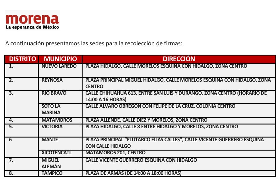 Ciudad Victoria, Tamaulipas. — Morena Tamaulipas convocó a un levantamiento simultáneo de firmas este domingo 16 de noviembre a partir de las 13:00 horas en diez municipios del Estado, con el objetivo de respaldar la solicitud de que la Suprema Corte de Justicia de la Nación (SCJN) revise el juicio de amparo indirecto 2477/2022, promovido por el exgobernador Francisco Javier García Cabeza de Vaca.