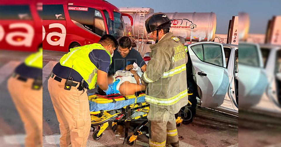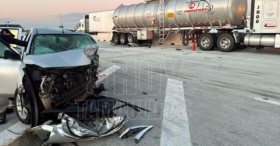 Nuevo Laredo, Tamaulipas. — Un accidente ocurrido en el kilómetro 192 de la autopista a Nuevo Laredo dejó como saldo a dos hombres de seguridad privada, con heridas de gravedad, luego de que el vehículo en el que viajaban chocó contra un tractocamión tipo pipa.