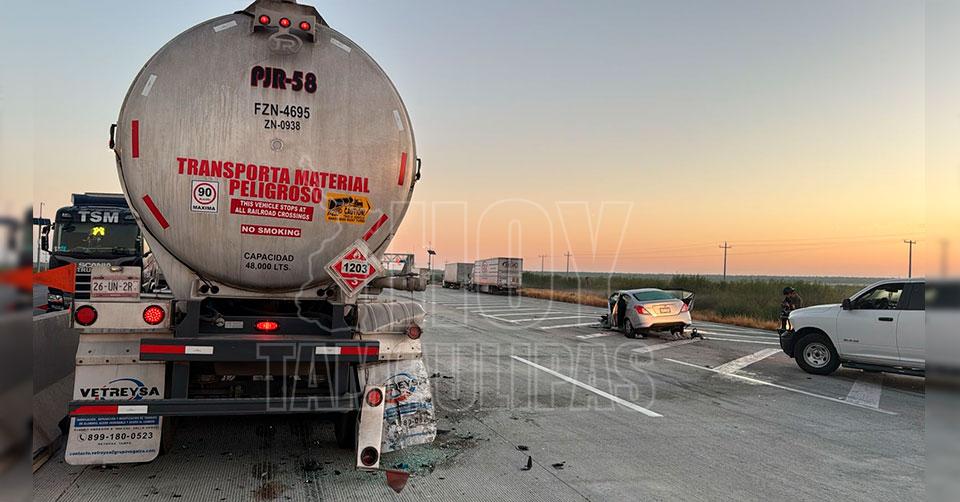 El percance ocurrió cuando el automóvil Nissan VDrive, utilizado por la empresa de custodios, impactó de lleno contra la parte trasera de una pipa marca Kenworth, perteneciente a la compañía JR Transporte.