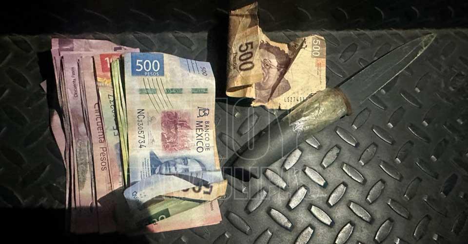 Al realizar la inspección correspondiente, los agentes localizaron entre sus pertenencias 4 mil 200 pesos en efectivo, ocultos dentro de sus zapatos, así como un cuchillo que portaba a la altura de la cintura.