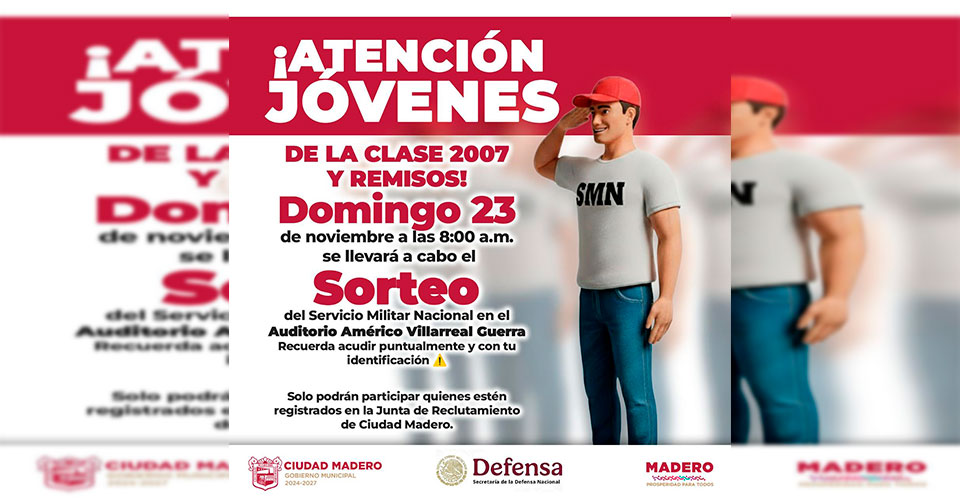 Ciudad Madero, Tamaulipas. - Por disposiciones de la Secretaría de la Defensa Nacional a través de la 48ava. Zona Militar, se informa a los conscriptos de la clase 2007 que el sorteo se llevará a cabo el próximo 23 de noviembre a las 8:00 am en el Auditorio Américo Villarreal Guerra en Ciudad Madero.