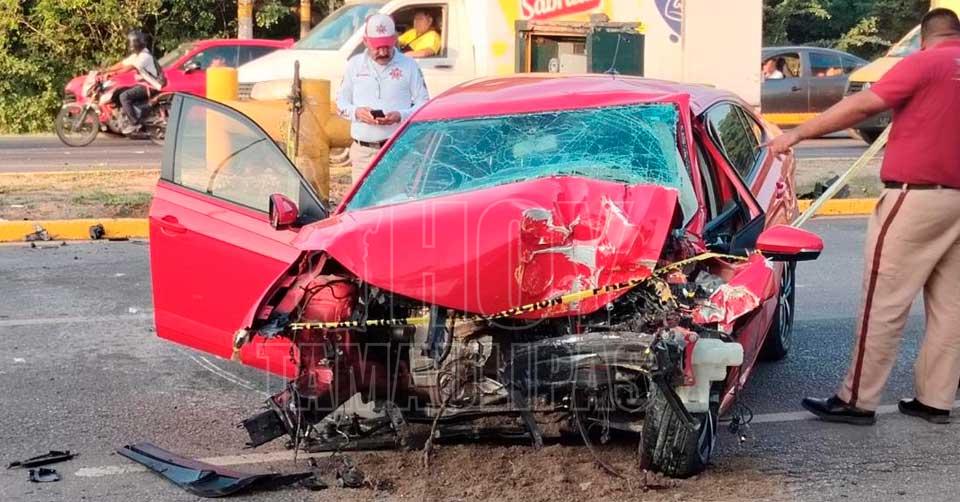 La unidad que terminó completamente destrozada es un carro Volkswagen Virtus color rojo con placas de Tamaulipas, que era guiado con evidente exceso de velocidad.