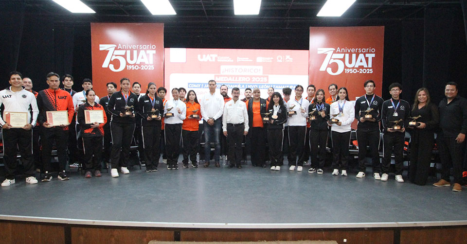Ciudad Victoria, Tamaulipas.- El rector de la Universidad Autónoma de Tamaulipas, Dámaso Anaya Alvarado, hizo entrega del reconocimiento “Correcaminos Orgullo UAT” a estudiantes medallistas nacionales, en un emotivo acto que destacó el desempeño histórico de la casa de estudios en los Campeonatos Nacionales ANUIES 2025, en el que la institución obtuvo 24 preseas (7 oros, 8 platas y 9 bronces), superando ampliamente los resultados de 2024, y todas las marcas mantenidas desde 2006, para consolidarse como referente de élite en el deporte universitario.