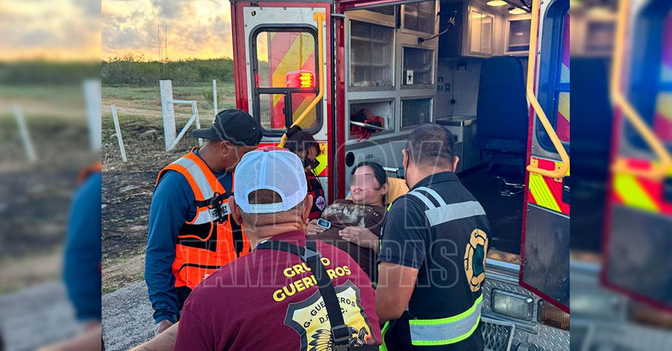 Matamoros, Tamaulipas. — Un fuerte accidente se registró en el kilómetro 27 de la carretera a La Playa dejó como saldo seis personas lesionadas, luego de que una camioneta Nissan Rogue terminó volcada fuera de la cinta asfáltica y dentro de un predio.