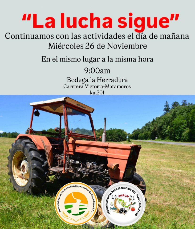 A través de un volante difundido en las redes, bajo el lema “La lucha sigue”, se convoca a los agricultores a agruparse a las 9:00 de la mañana de este miércoles 26 de noviembre en la Bodega La Herradura, ubicada en el kilómetro 201 de la carretera federal Victoria–Matamoros.