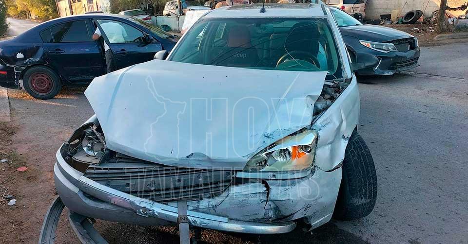 Nuevo Laredo, Tamaulipas. — Un aparatoso accidente vial se registró al sur de Nuevo Laredo, en la colonia Primavera, luego de que el conductor de un automóvil no respetó la señal de alto, impactó una camioneta y la lanzó contra la malla ciclónica de un predio particular.