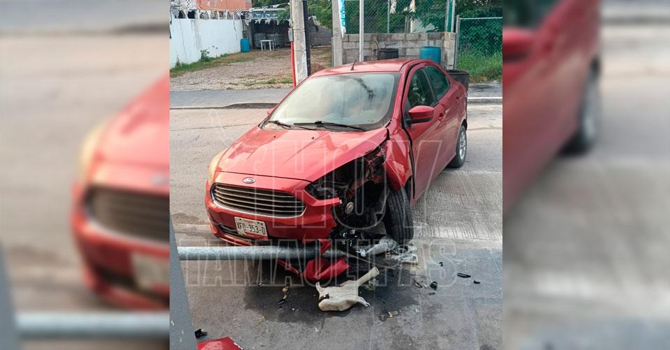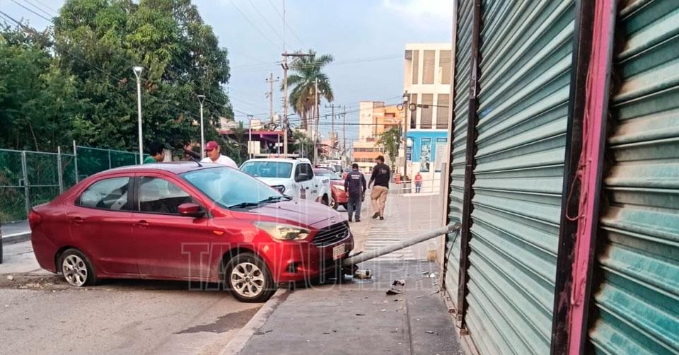 Altamira, Tamaulipas.-A unos metros de la plaza principal de Altamira, el conductor de un automóvil se impactó contra un poste de alumbrado público, el cual fue proyectado contra la cortina metálica del restaurante Sabor a Mí.