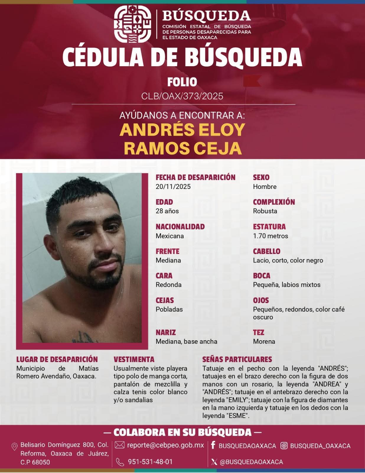 De acuerdo con las descripciones incluidas en las pesquisas, Andrés Eloy vestía playera tipo polo, pantalón de mezclilla y tenis blancos; Juan José llevaba playera gris de cuello redondo, pantalón de mezclilla y tenis azules.