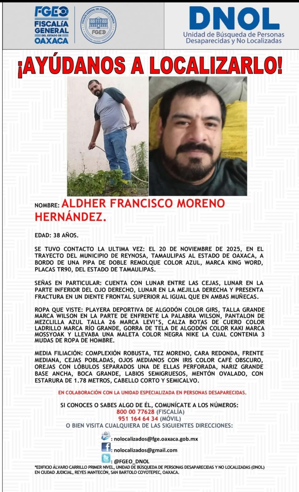 Informó que los cuatro hombres viajaban en pipas con destino a Matías Romero. Mantuvieron comunicación con sus familias hasta que ingresaron a esa zona, pero su rastro se perdió justo en el punto donde se localiza un retén militar. Desde entonces no se tiene información sobre su paradero.