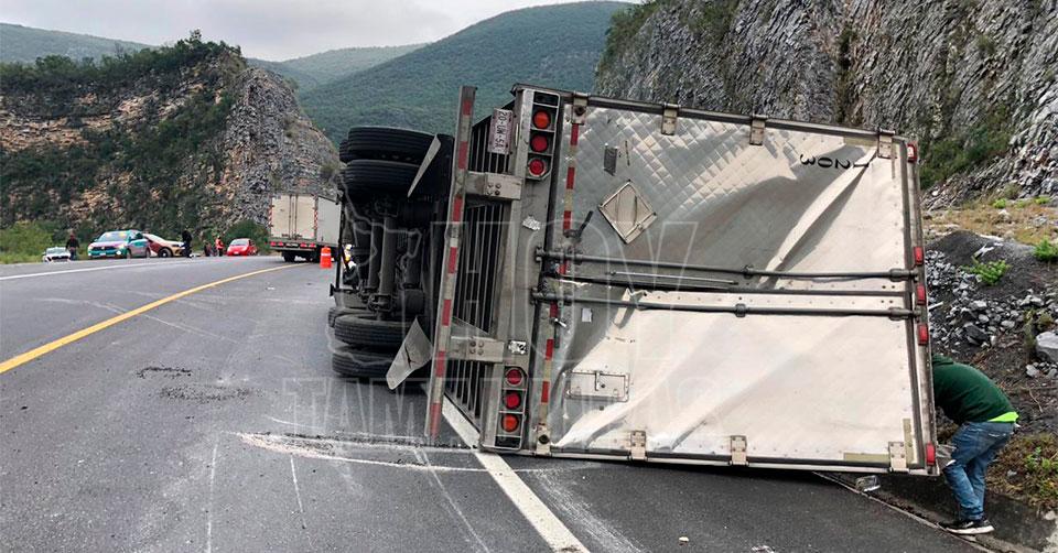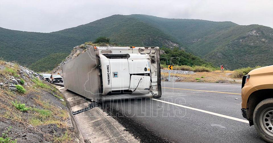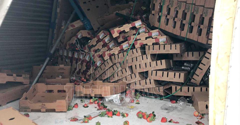 Ciudad Victoria, Tamaulipas. - Un tráiler que transportaba fresa volcó en el kilómetro 12 de la carretera Rumbo Nuevo. El operador de la unidad resultó ileso.