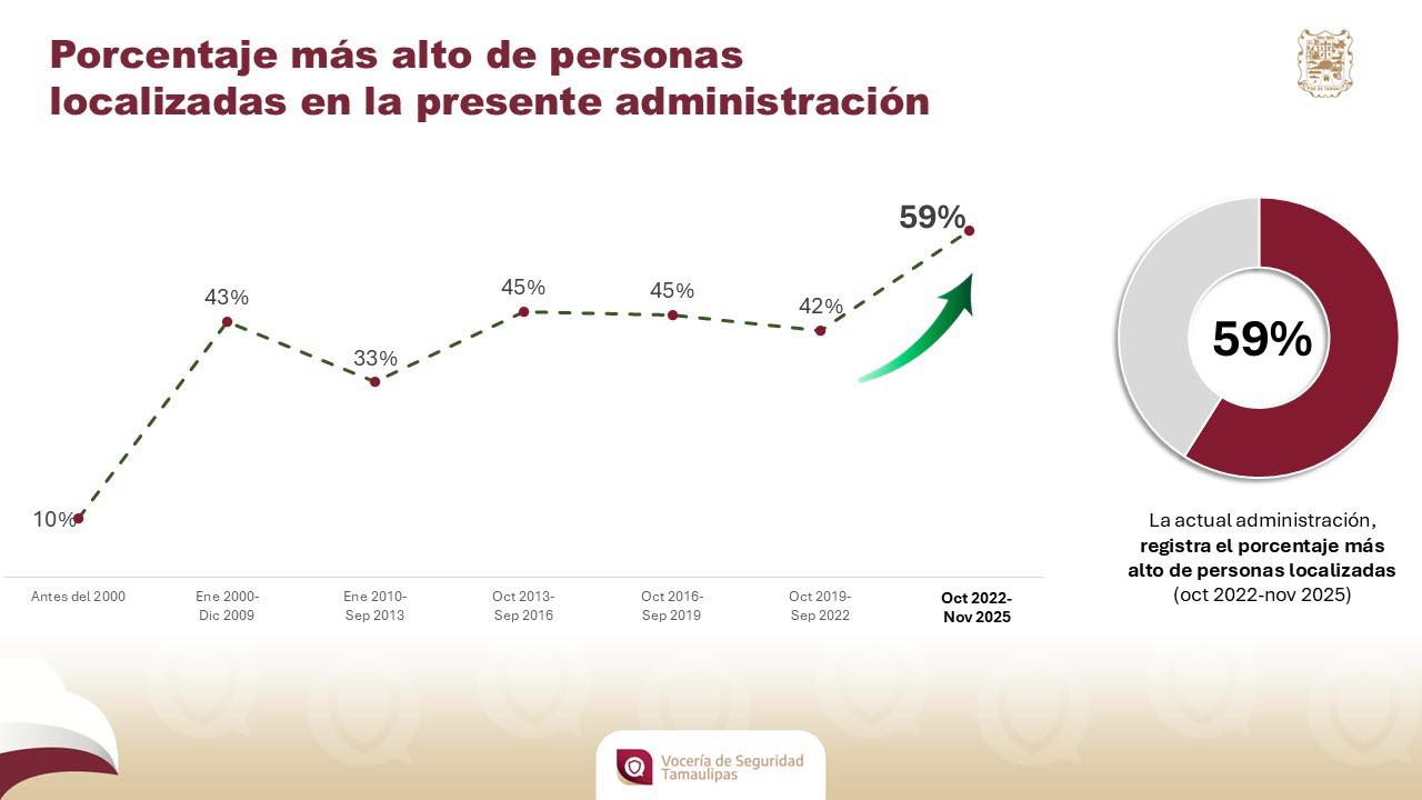 Ciudad Victoria, Tamaulipas.- Durante esta administración, Tamaulipas ha registrado su mayor avance en la búsqueda de personas desaparecidas, con el 59% de los casos localizados, de acuerdo con el Registro Nacional de Personas Desaparecidas y No Localizadas (RNPDNO).