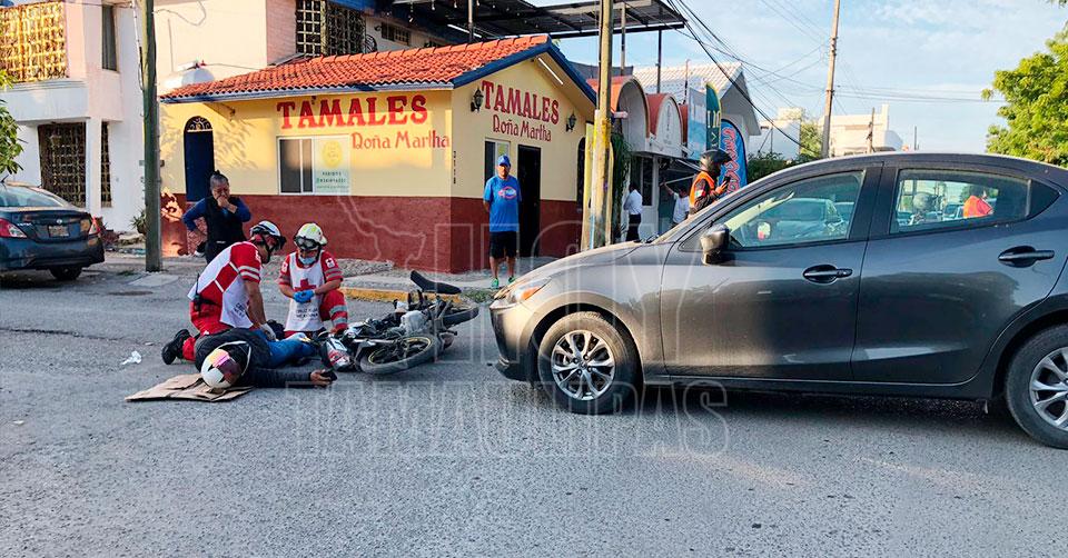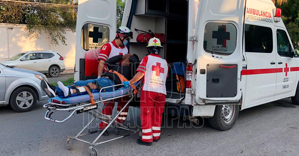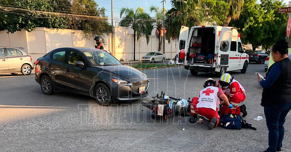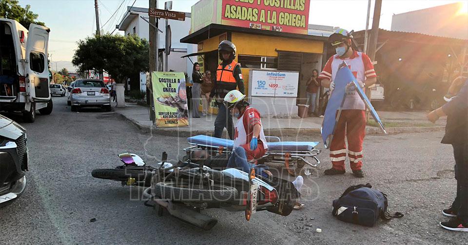 Ciudad Victoria, Tamaulipas. - Un motociclista resultó con fractura expuesta en el tobillo luego de ser impactado por un automóvil la tarde de este miércoles en el cruce del 16 y Sierra Vista.