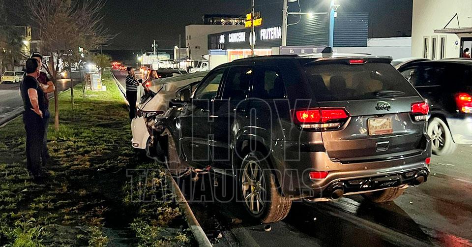 Reynosa, Tamaulipas. – Un aparatoso choque ocurrió en la avenida Vista Hermosa y calle 15, luego de que el conductor de una camioneta Kia blanca, identificado como director de una escuela, realizara un retorno sin precaución y se atravesara al paso de una Jeep Grand Cherokee que se desplazaba de sur a norte.