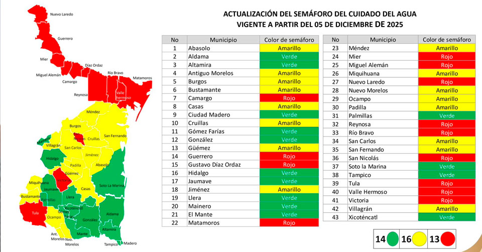 En el desglose municipal del Semáforo del Cuidado del Agua, figuran en color rojo: Camargo, Guerrero, Díaz Ordaz, Matamoros, Mier, Miguel Alemán, Nuevo Laredo, Reynosa, Río Bravo, San Nicolás, Tula, Valle Hermoso y Victoria.