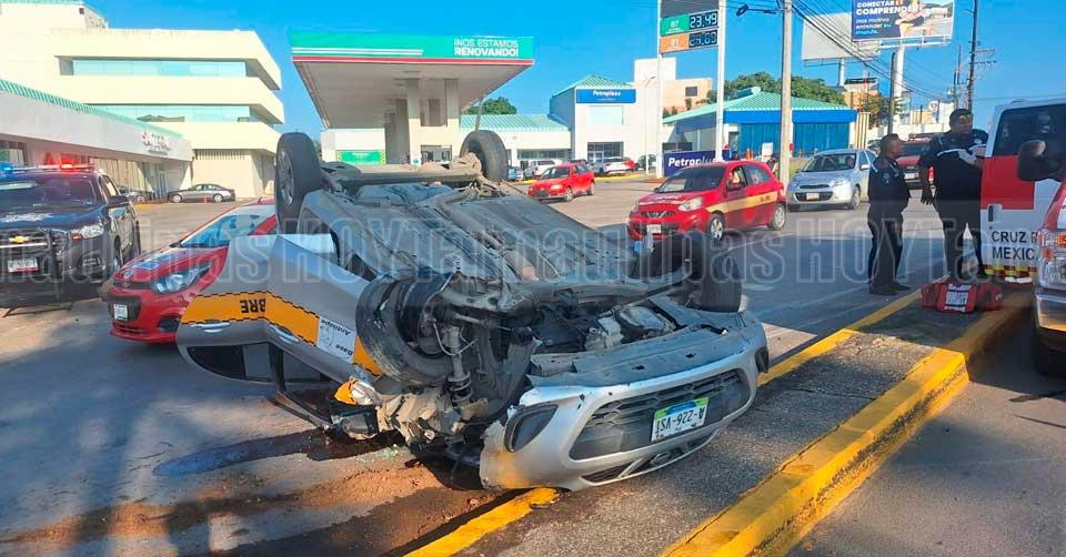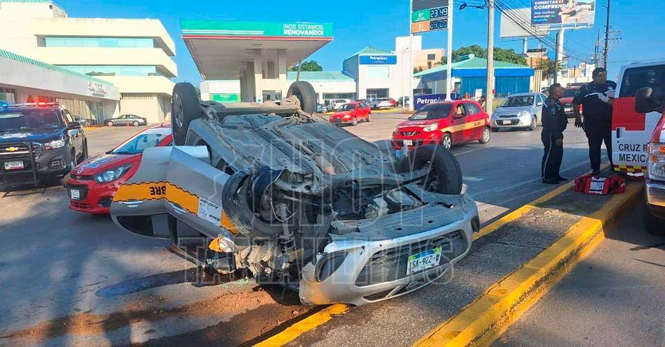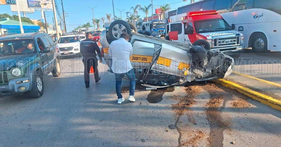 Tampico, Tamaulipas. - El exceso de velocidad con el que se desplazaba y la falta de pericia al conducir, provocaron que el operador de un taxi sea habilitado como carro de ruta perdiera el control del volante y se impactara contra una lámpara de alumbrado público en Tampico, terminando el vehículo volcado con cuatro personas que presentaron lesiones menores.