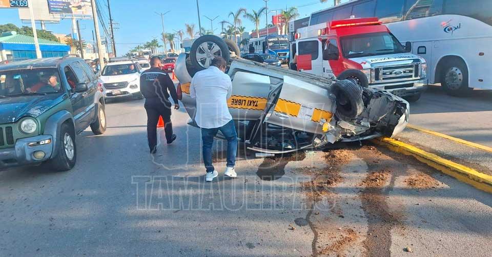 Veloz taxista se impactó con una lámpara y terminó volcado en Tampico