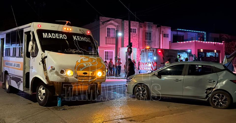 Ciudad Madero, Tamaulipas. - Al menos 10 pasajeros de un microbús que cubría la ruta Madero-Heriberto Kehoe -Las Flores, resultaron con algunas lesiones al impactarse la unidad contra un automóvil la noche de este viernes en Madero.