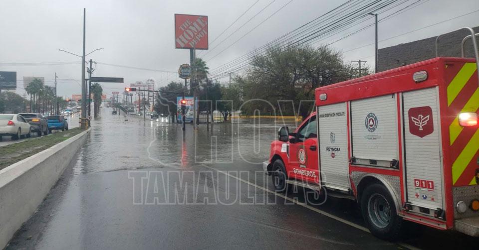 Reynosa, Tamaulipas.- Fuerte lluvia se registró este mediodía en Reynosa como consecuencia de la entrada del nuevo frente frío, dejando severos encharcamientos en principales avenidas.