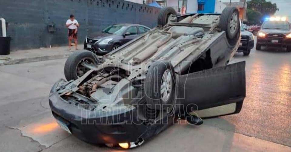 Tampico, Tamaulipas. - Un automóvil compacto quedó abandonado y con las llantas hacia el cielo en calles de la zona norte de Tampico, al volcar luego de que conductor se desplazaba con evidente exceso de velocidad.