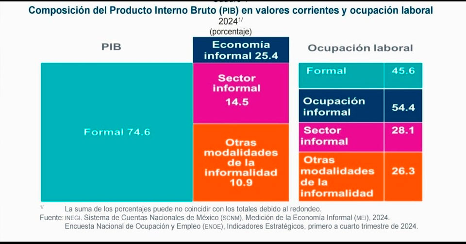 Sin embargo, esa mayoría laboral solo generó 25.4% del PIB nacional, mientras que el 45‑46% formal aportó 74.6% del producto, según la Medición de la Economía Informal del propio INEGI.