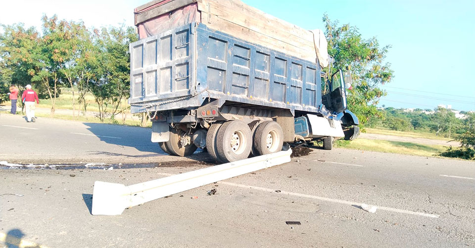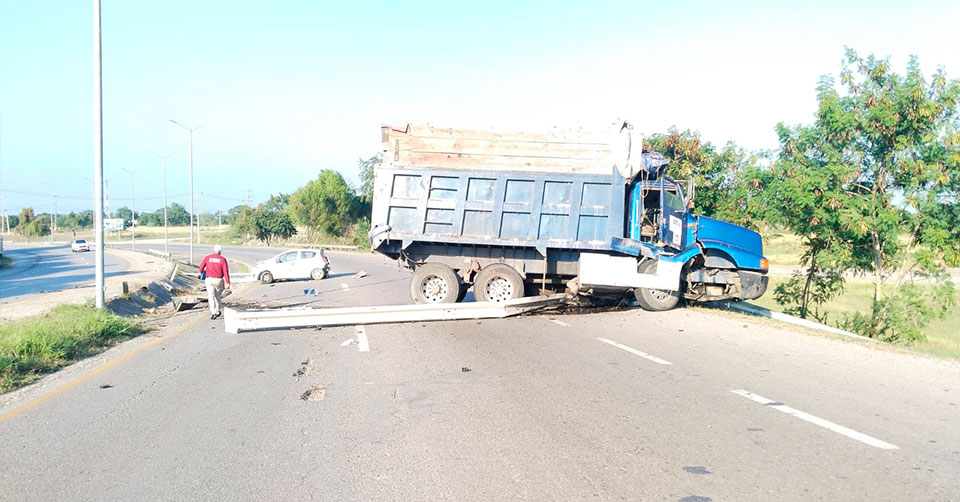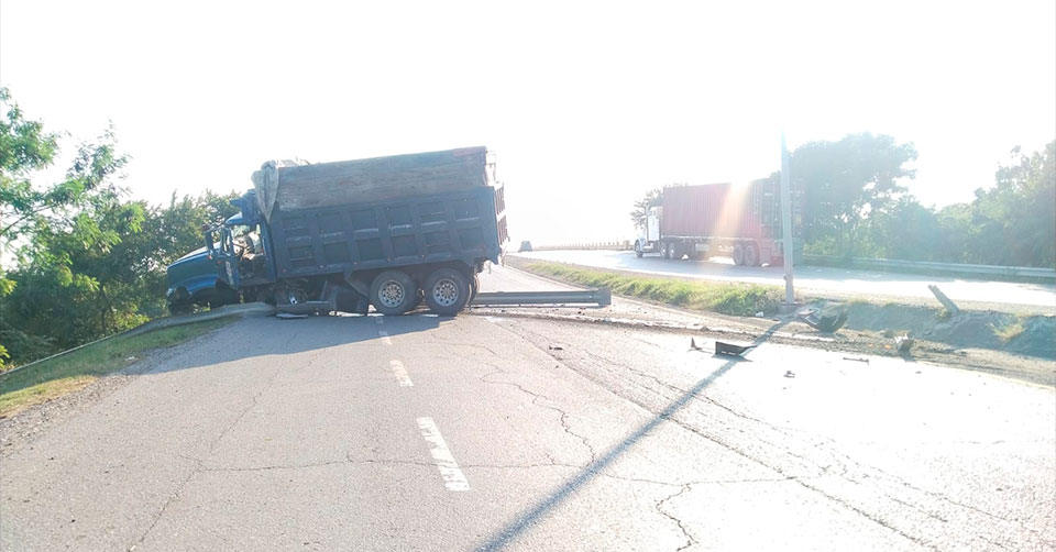 En el sitio, peritos de Tránsito establecieron que el automóvil Chevrolet color blanco fue impactado por un camión de volteo azul, el cual además dañó un tramo de barandal metálico de contención.
