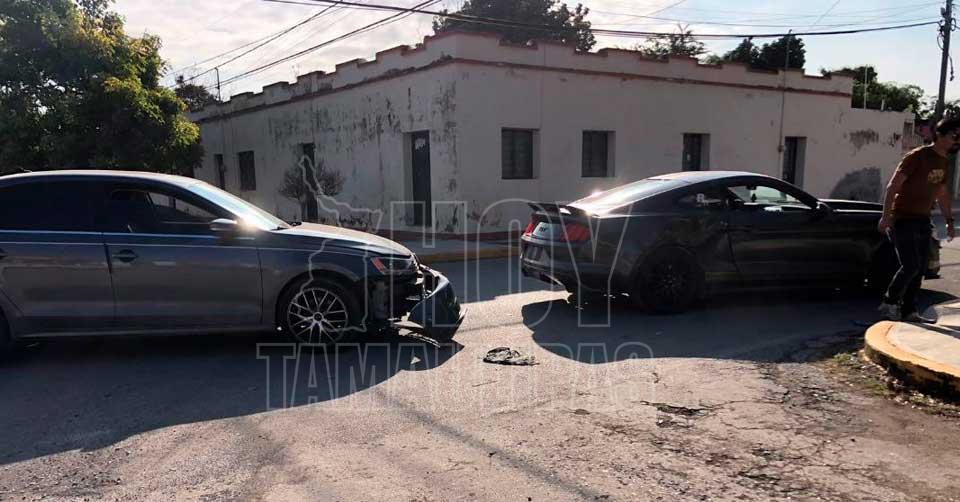 Ciudad Victoria, Tamaulipas. – Un choque se registró en el cruce del 14 Alejandro Prieto, en la zona centro de Ciudad Victoria, luego de que el conductor de un Volkswagen Jetta presuntamente omitiera una señal de alto y se impactara contra un Ford Mustang Shelby.