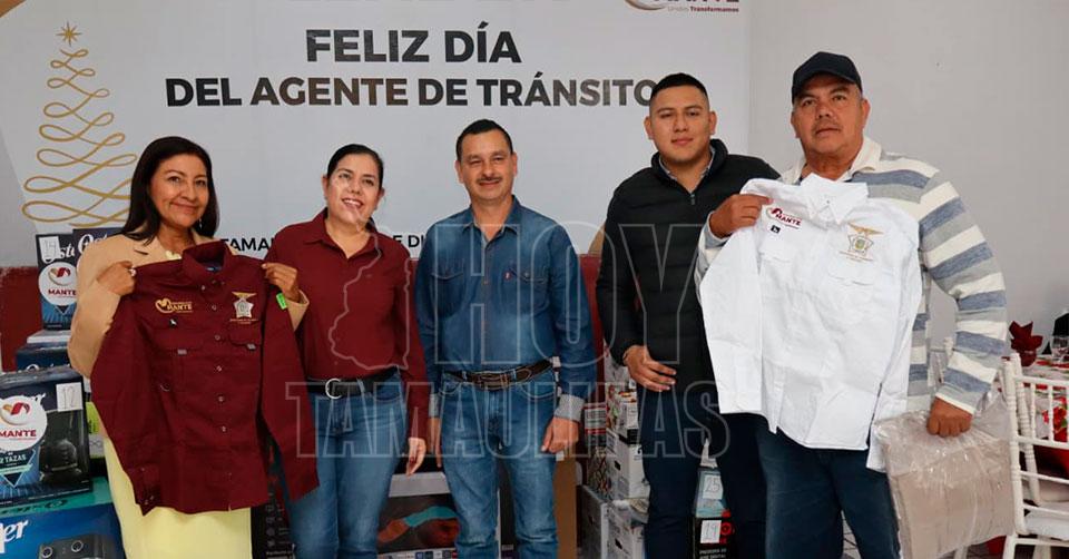 El Mante, Tamaulipas. - La presidenta municipal, Patty Chío, acompañada por el director de Tránsito y Vialidad, Jorge Tinajero, encabezó este reconocimiento en el que se llevó a cabo la entrega de uniformes y obsequios a las y los elementos, como muestra de agradecimiento a su vocación de servicio y responsabilidad con la ciudadanía.